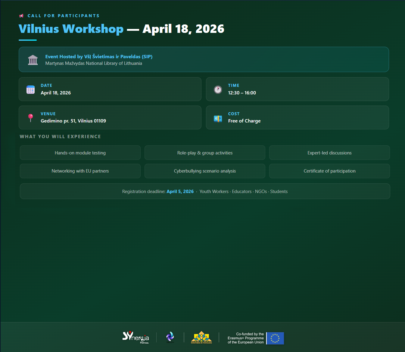 Co-funded by the European Union, this 12-month project brings together a dedicated consortium of partners: SYNERGIA (Portugal), POLIVISION Foundation (Poland), and VšĮ Švietimas ir paveldas (SIP) (Lithuania). Together, they are working to create a safer, more supportive online environment for youth across Europe.